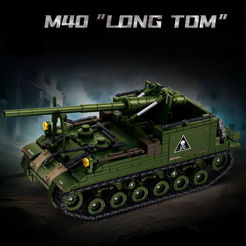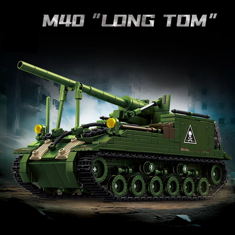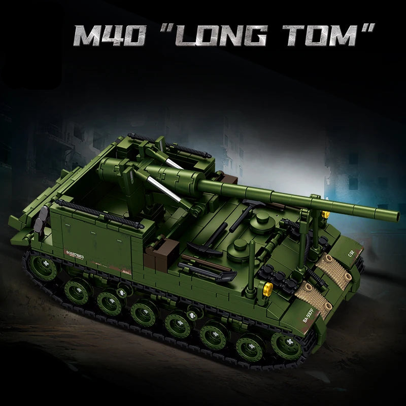Baue mit diesem detailreichen Bausatz aus 800 Bausteinen die legendäre M40 „Long Tom“, eine der bekanntesten schweren Selbstfahrlafetten der US-Armee im Zweiten Weltkrieg. Die M40 wurde 1944 eingeführt und basierte auf dem Fahrgestell des M4 Sherman. Sie diente vor allem zur weitreichenden Artillerieunterstützung und kam unter anderem in der Endphase des Krieges in Europa zum Einsatz.