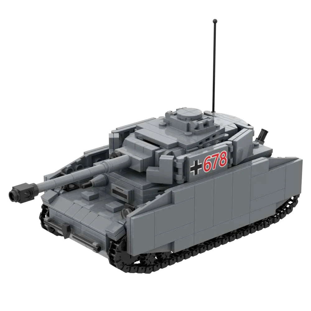 Baue den Panzerkampfwagen IV Ausführung H mit diesem Bausatz aus 524 Bausteinen nach. Der Panzer IV war das Rückgrat der deutschen Panzertruppen im Zweiten Weltkrieg. Die Variante Ausf. H, eingeführt 1943, erhielt die charakteristischen Schürzen-Seitenschürzen zur zusätzlichen Panzerung und war mit der langen 7,5-cm-KwK-40-Kanone ausgestattet.